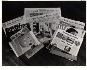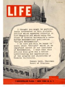 Portraits of Eminent Mathematicians, a portfolio of portraits and biographical information on famous mathematicians through the ages, fit Scripta Mathematica’s mission of mathematics for the masses, popularizing math for the lay reader. This characteristic may have contributed to Scripta Mathematica’s inclusion in the time capsule, in the category of “Our Sciences and Techniques,” together with articles from the Encyclopaedia Britannica. But how would two volumes of Portraits of Eminent Mathematicians, each a bit over 14 inches in height, fit into the time capsule which measured slightly more than 8 inches in diameter, along with all the other items? The solutions was miniaturization onto microfilm, a relatively new technology at the time. The time capsule was outfitted with a magnifying glass for reading the microfilm, as well as instructions for constructing a more sophisticated microfilm viewer.Scripta Mathematica was known the world over; authors and subscribers hailed from around the globe. Albert Einstein served as Chairman of the Honorary Advisory Board of the Friends of Scripta Mathematica. An undated press release from the 1930s, prior to the Second World War notes: “More than 250 colleges in America and in other parts of the world are subscribers to the journal. The contributors include scholars from Japan, India, Russia, Italy, Palestine, France, Germany, and every part of the world where scholarship flourishes.” Scripta Mathematica and Jekuthiel Ginsburg’s efforts to equalize mathematics for all were featured in numerous American publications such as The New York Times Magazine,Life Magazine and the New Yorker, as well as periodicals in England, Greece, Switzerland, France, and Germany. Scripta Mathematica’s program for promoting mathematics “has been described in Amerika, the U.S. Government publication issued in Russia; by the U.S. Information Agency and other governmental groups.” The World’s Fair marked a turning point in the history of the world; the Fair opened not long before the outbreak of the Second World War and closed in 1940 in the midst of the War. Scripta Mathematica was viewed by its creators during this time period as a bulwark against prejudice and hatred, and sought, by dint of its very existence, to set an example of harmony for the world. Scripta Mathematica featured all over the worldAs early as 1933, Bernard Revel expressed these sentiments in a letter to Ginsburg regarding Scripta Mathematica: